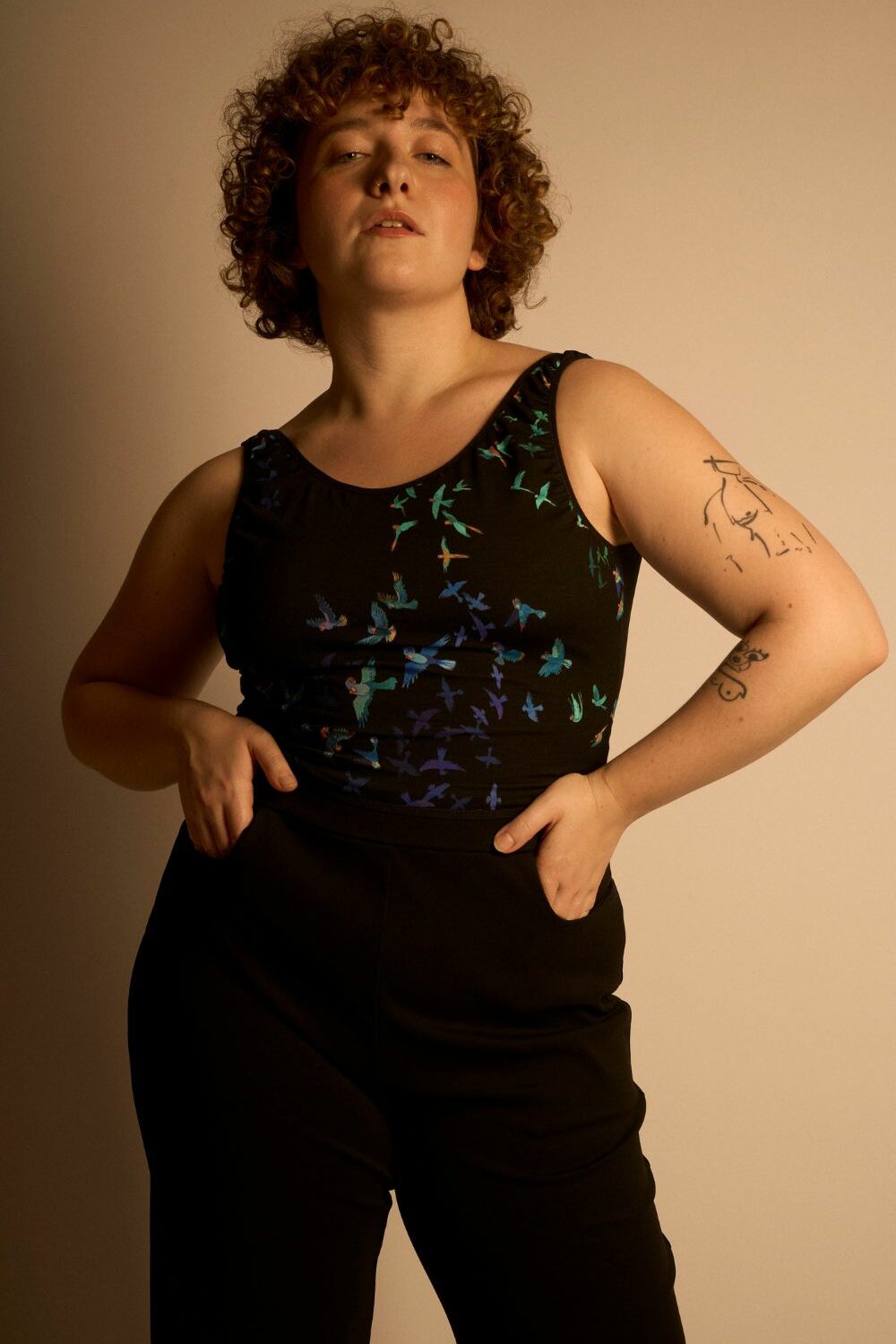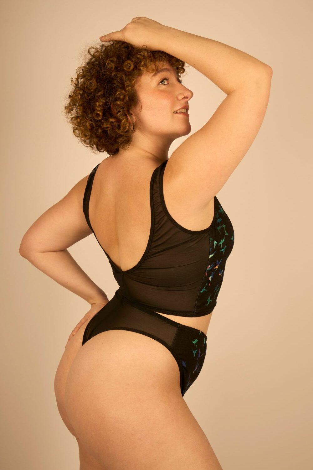 Le tulle stretch transparent se mêle à l’imprimé Ara : un envol d’oiseaux tropicaux aux couleurs vibrantes, peint à la main par Lou Ripoll – créatrice de Bleu Tango.